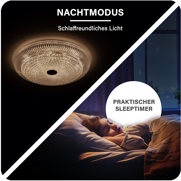 Die Sleeptimer-Funktion für sehr gedämpftes schlaffreundliches Licht aktivierst Du mit der Fernbedienung. Die Leuchte schaltet sich ca. 30 Minuten nach Aktivierung selbst ab.
